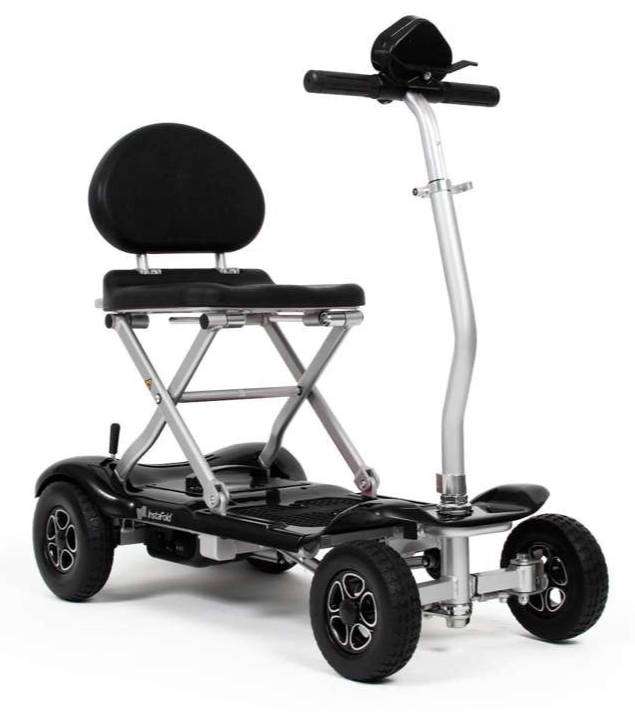 The InstaFold Folding Mobility Scooter can be automatically folded down at the touch of a button. Using the easy-to-operate remote control key fob, the scooter will fold up or down effortlessly in seconds, making it easier than ever to get ready for travel or transport with your scooter. The scooter can also be folded using the button on the battery pack, should you not have the key fob to hand, which is useful when travelling.