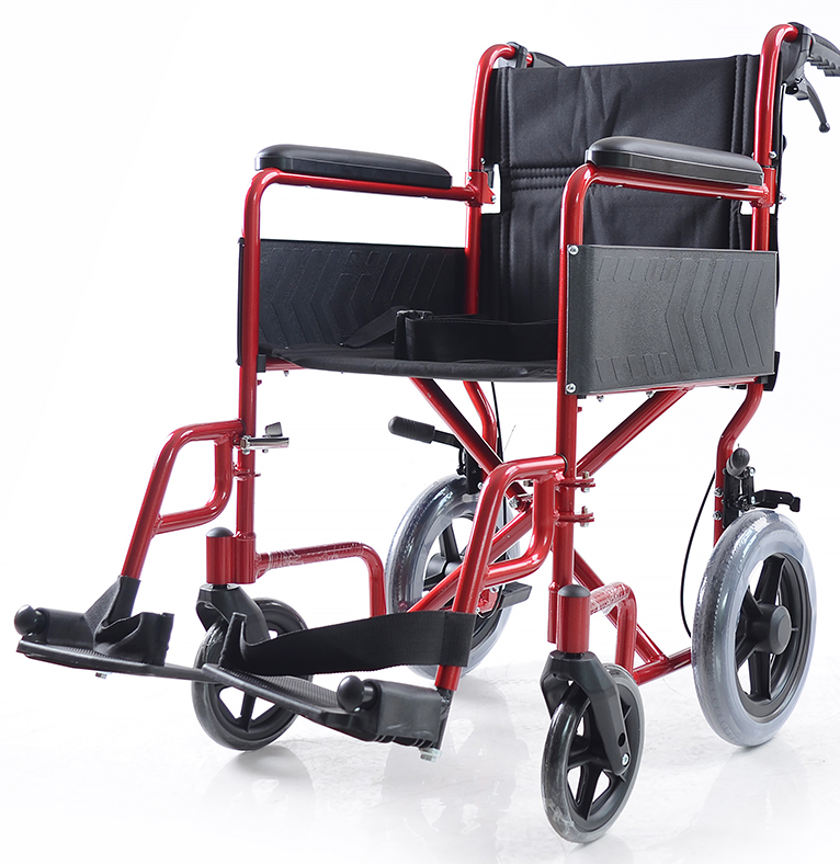 A stylish lightweight occasional use wheelchair with convenient attendant brakes, complete with black wheels and castors. It folds quickly and easily for transportation and storage.