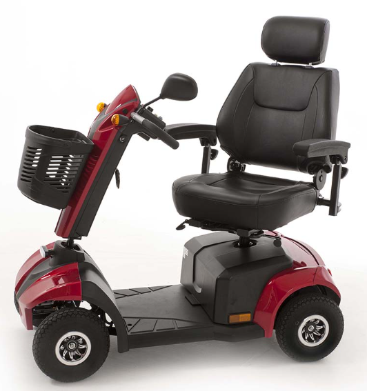 The MM8 Marvel Mobility Scooter is a road-legal mobility scooter with a maximum speed of 8 mph and a range of up to 22 miles. It has a steel frame, full suspension, and a captain’s seat for comfort. The MM8 mobility scooter is available in red and blue.