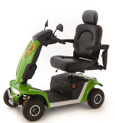 The Vogue XL is a road-legal mobility scooter with a maximum speed of 8 mph, a range of up to 30 miles and an impressive weight capacity of 32 stone. It has a steel frame, full suspension, and a captain’s seat for comfort. The Vogue XL is available in blue, green and orange.